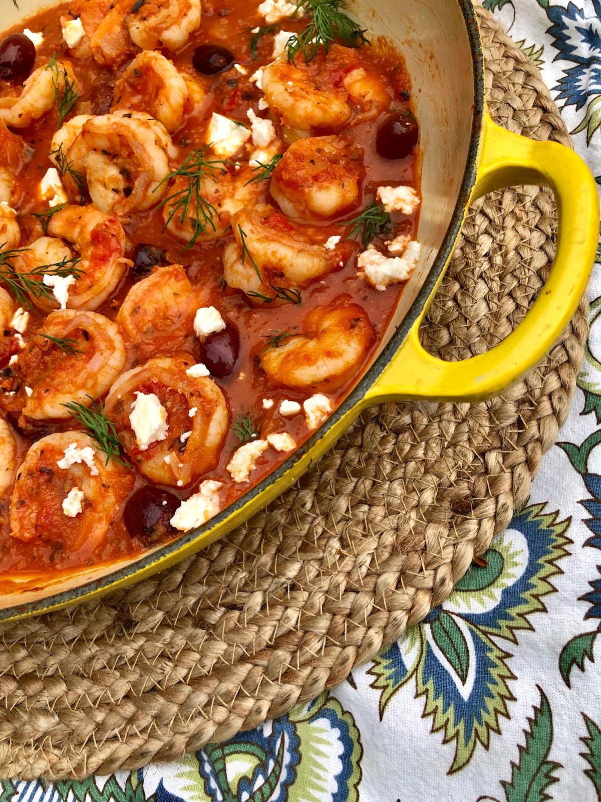 Last week, I had a couple friends over for an impromptu summer dinner. With not just pasta sauce, all I needed was a handful of additional ingredients for a one-dish wonder that was ready in minutes. The tangy sauce packed with flavor and a bit of sweetness melded perfectly with the juicy shrimp, salty feta, and briney punch from the olives. With a glass of crisp rosé in one had, I poured the tomato dish over my favorite summer pasta shape, orzo with a sprinkle of fresh dill from my urban garden. To go with the casual dinner and balmy evening, I carried the dish as is onto my deck and served family style.